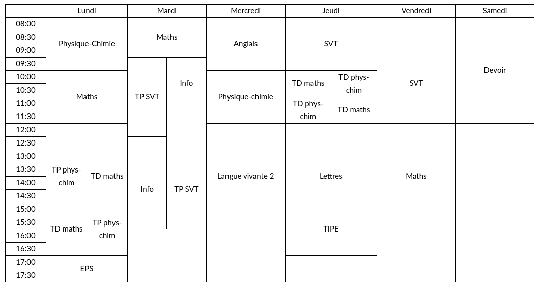Attention : cet emploi du temps de première année n’est qu’un exemple. Autant de lycées, de classes, autant d’emplois du temps différents! Le samedi matin est travaillé dans certains lycées seulement, la façon dont s’opère la division en groupe, la longueur de la pose déjeuner dépend des établissements